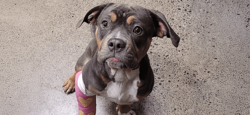 Discovered in a ditch with a broken leg and old wounds on her thin body.