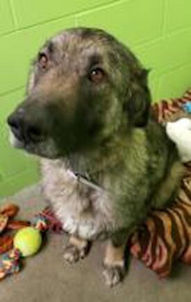 Boswell’s foster mom was Shannon. She bathed Boswell, took him to multiple vet visits, medicated him and even bought booties on suspenders to protect his feet. Boswell was an absolute doll and such a gentle giant through it all.
