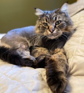 Walter is extremely chatty and loves to talk to me. He always has something to say. It’s usually that he wants second breakfast, dinner or treats. He loves having a windowsill to sit on to watch the birds outside or lounging in the sun.