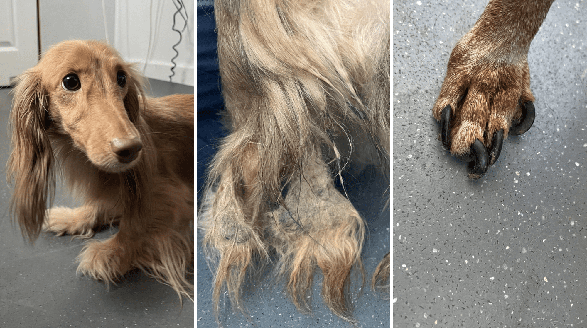 Many of the dogs, who range from 12 weeks to 12 years old, have severely overgrown nails. Some were so long they had curled and embedded into the paw pads, requiring a surgical procedure to be removed. Those with long hair had clumped mats caked with feces. From their condition, it appeared they were rarely free to roam outside of their crates. Their world confined to a tiny area where they were forced to live in their own mess with no stimulation and little comfort.