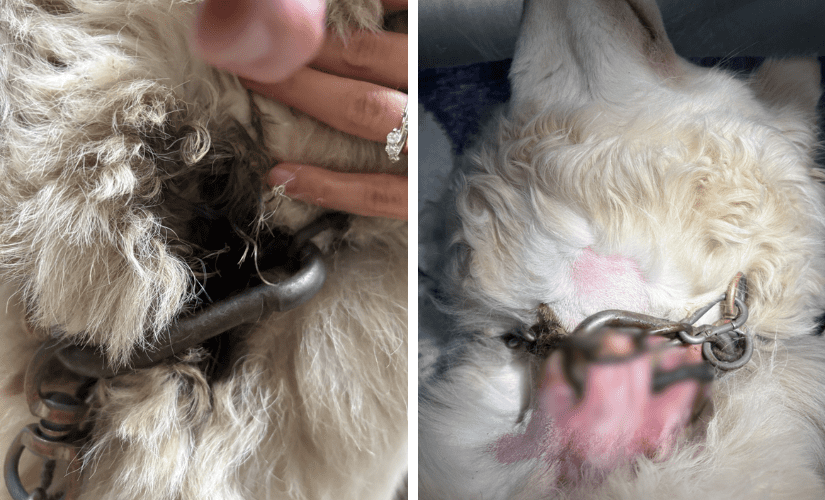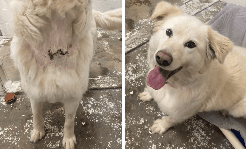 On November 4, a BC SPCA animal protection officer, responding to a complaint received, discovered a four-year-old golden retriever mix tethered with a heavy chain wrapped around her neck on a remote property west of Prince George. The chain appeared to be embedded in the dog’s neck, but the true extent of her injuries was hidden by her thick fur. The owner surrendered the dog to the officer, who brought her to the BC SPCA Quesnel animal centre.