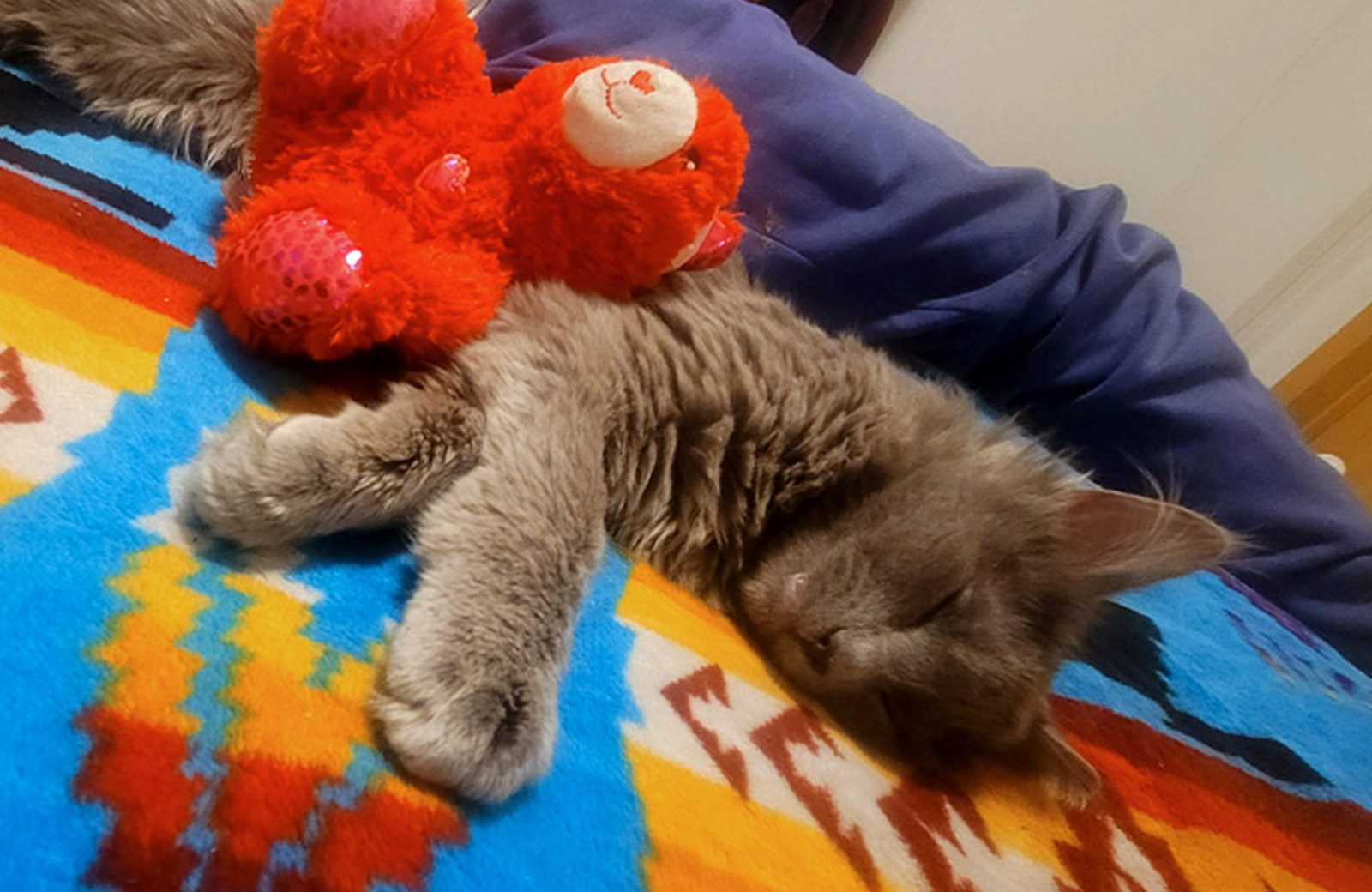 A few days after adoption, they reported things are going great! Still a bit shy, but showing steady improvement as he adjusts to his new environment. “It took him a little bit to ‘come out of his cage’ so to speak” says Nicole, “He was really comfortable sleeping under the bed for a bit there, but now he lets the kids play with him. He also loves to cuddle and purr”. Nicole’s children are absolutely smitten with John (now also going by Smokey!) and the young kitten loves spending his time with all the fam.