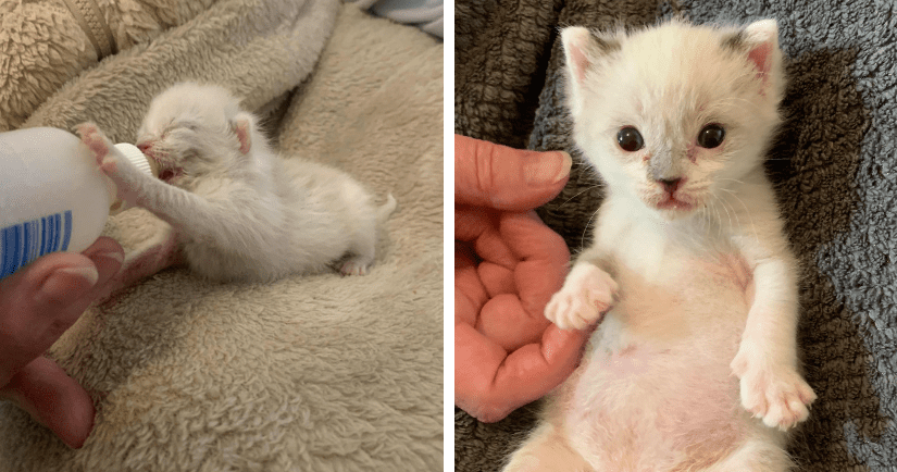 Paille says they are cautiously optimistic about the kitten’s health. “This kitten has a fighting spirit. The foster says he is eating well and is gaining weight.”