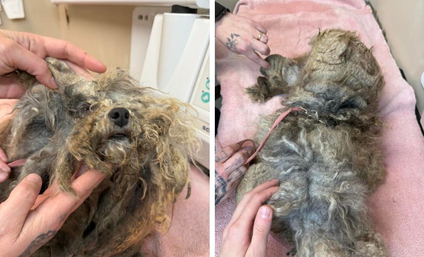 On November 18 while responding to concerns of animal cruelty, a BC SPCA animal protection officer found a heartbreaking sight. A heavily matted dog was lying in the snow, no shelter in sight on a remote property east of Prince Rupert. The dog, a seven-year-old poodle mix was almost unrecognizable. She was shivering in the cold and unable to put any weight on her left rear leg. After discussing the dog’s condition with her owner, she was surrendered to the BC SPCA.