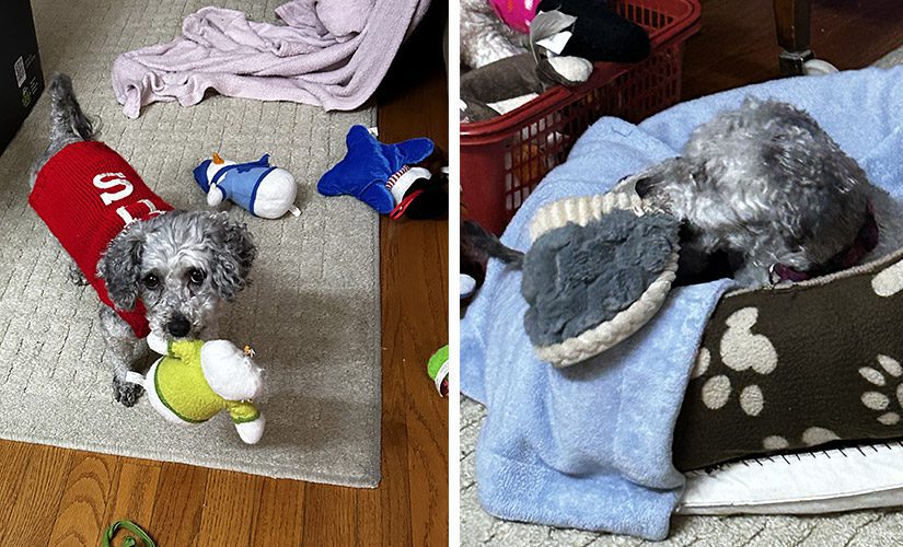 When Trixie isn’t snoozing close with her humans or charming the neighbourhood, she can be found playing with her toys. “Every morning, she wants me to throw them for her” Helen told us. “I told her: only five throws before a break or we’ll be there all day! But she understands and she’s happy chewing and playing by herself. She particularly loves one of her squeaky toys. That one came with her from the BC SPCA and she’s never without it. If she forgets to bring it upstairs, she runs down to grab it. It’s fun and she definitely keeps us busy!” Helen also mentioned that many of the toys were her previous dog’s and it’s nice to see them being enjoyed again.