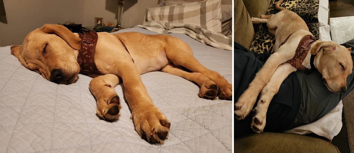 Outside of exploring new parts of the world each day, like any growing puppy, Finnigan needs lots of time for naps too!