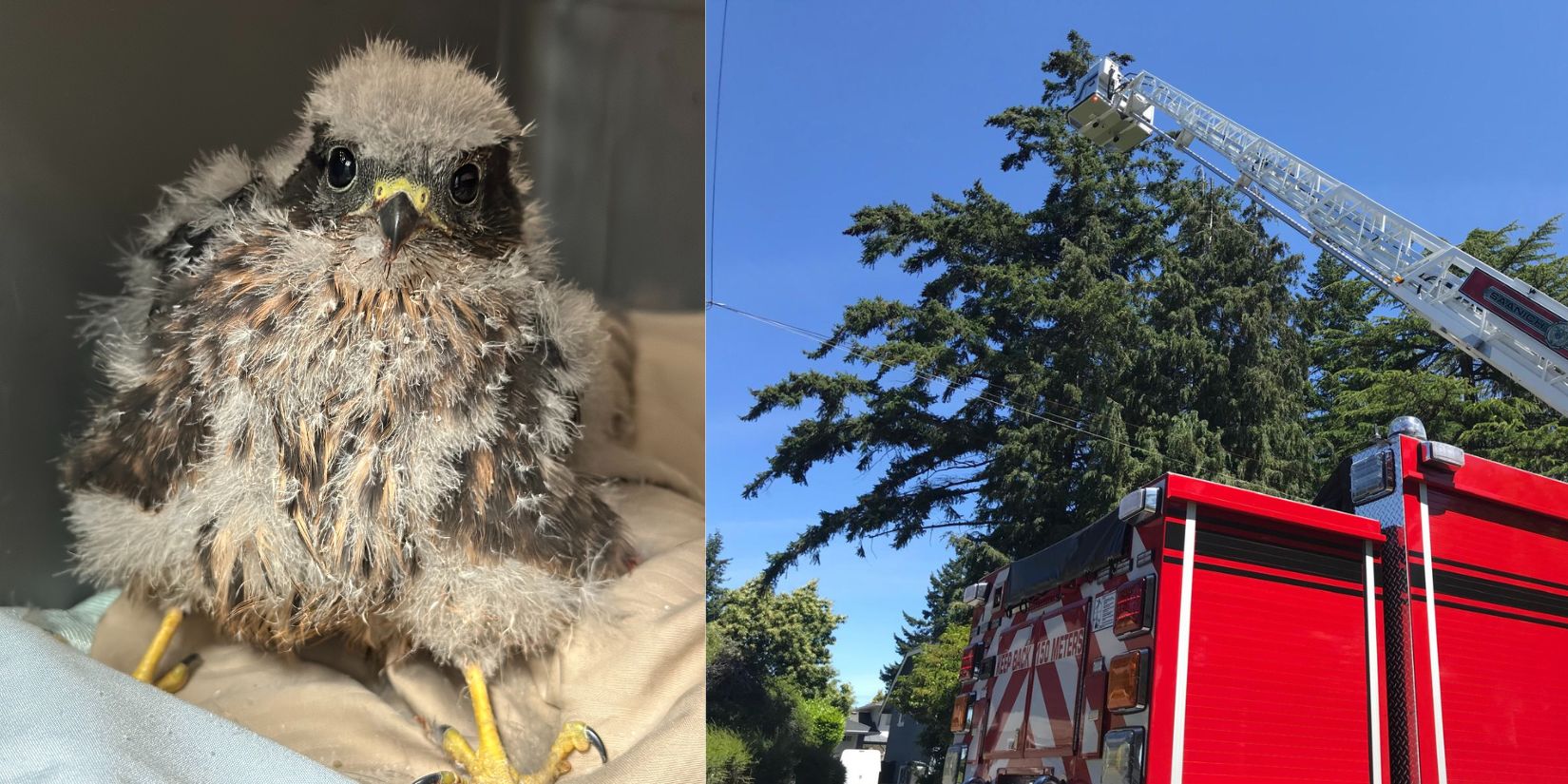 Merlins are not frequent patients at Wild ARC, which makes 2025 an exceptional year for this small but fierce species of falcon with a total of nine admittedmore than in the last three years combined. Two of these were young Merlins who arrived just two days apart. Brought in by different rescuers but from the same neighbourhood, it soon became clear that they were siblings who had fallen from their nest too early. Determined to help, the rescuer of the second Merlin tracked down the nesting tree and connected Wild ARC with the property owners. With the nest located high in the tree, Wild ARC needed help to reach it, and the Saanich Fire Department stepped in with their bucket truck! Thanks to teamwork, persistence, and a caring community, Wild ARC staff were able to safely place both young falcons back into their nest, successfully reuniting them with their parents within just a few days of their untimely fall.
