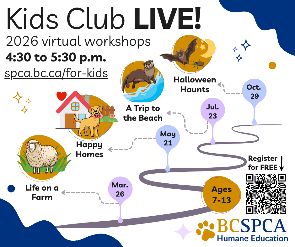 Kids Club members across the province are invited to join us for our virtual club meetings — Kids Club Live! These one-hour online gatherings are hosted by our team of Regional Humane Educators. Participants will get a unique view inside the BC SPCA, and will learn about animals and animal welfare issues through engaging activities, interactive games, and live connections with our team of Humane Educators.
